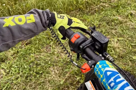 Fyrhjulingen är även utrustad med dödmansgrepp, det vill säga en säkerhetsbrytare som bryter och stänger av motorn, om olyckan skulle vara framme. Vi rekommenderar att barnen använder hjälm och lämplig skyddsutrustning.
