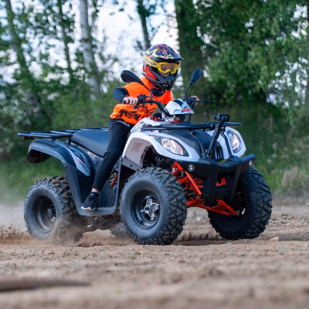 AU180 är en kraftfull ATV som lämpar sig för lite äldre barn. Under kåporna sitter det en pålitlig 4-taktsmotor och en CVT-växellåda med back. Styrningen är lätt tack vare den mycket goda stötdämpningen som också bidrar till mjuk körning på både väg och i tuffare terräng. Kombinerat med en stark och lätt ram ger det en mångsidig och framför allt rolig maskin.