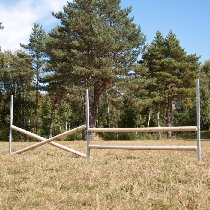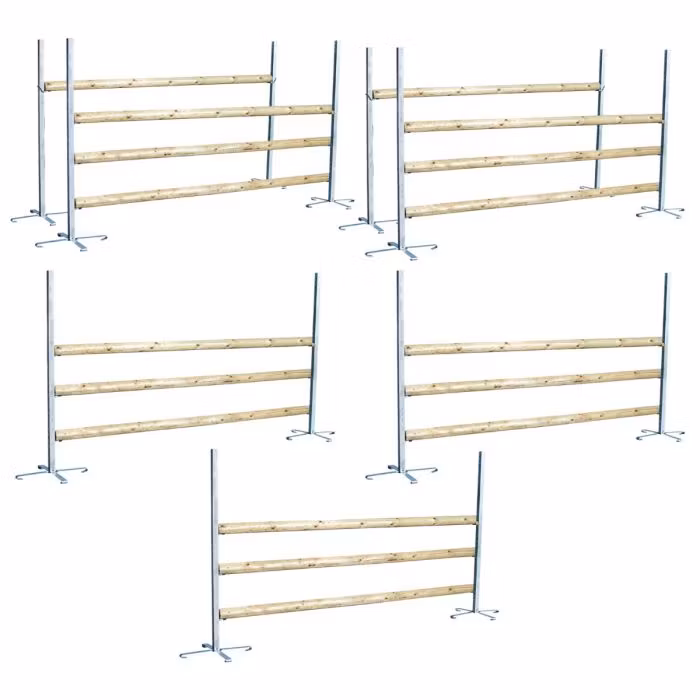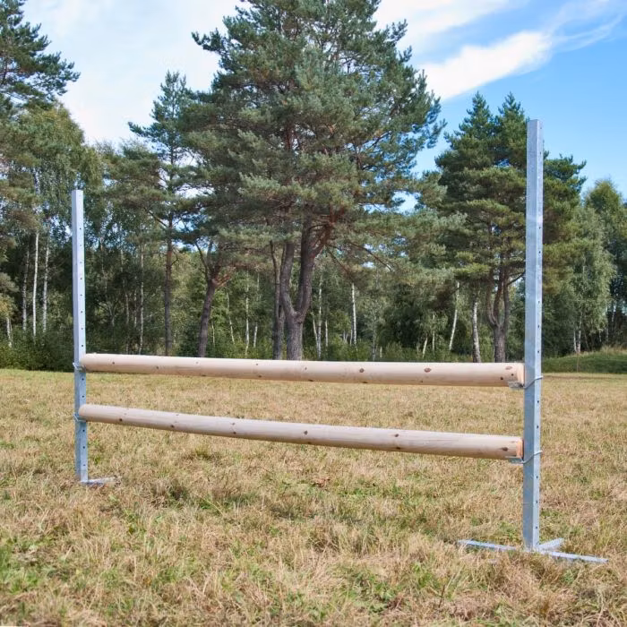 Hinderpaket Mellan Ett hinderpaket som innehåller 14 stöd, 17 bommar och 34 bomhållare, det räcker till t ex tre enkelhinder med tre bommar till varje och två oxrar med fyra bommar till varje, men varianterna är fler eftersom hinderstöden har hål för skållor på två sidor så du kan placeras skållorna åt två håll. Galvaniserade lätta hinderstöd som tål att stå ute. Hinderstödet har fötter i fyrkantsprofil i stål och hål för bomhållare med 5 cm mellanrum på två sidor av stolpen. Max bomhöjd 180 cm. Bommarna är rundsvarvade av obehandlad furu, 3 m långa, ø 10 cm. Impregnerad med NTR A.