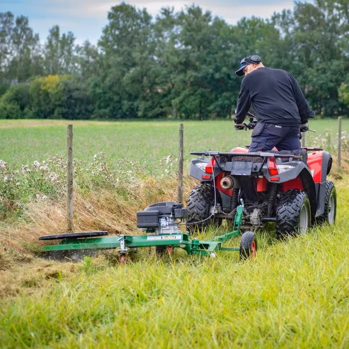 Kantklipparen för ATV arbetar med vanlig trimmertråd av vanlig, grövre modell, den är enkel att ersätta. Draget har många anpassningsmöjligheter både i höjd och sida för tillpassning mot olika dragfordon, smidigt transportläge gör flytten mellan hagarna enkel, levereras med 50 mm kulkoppling.