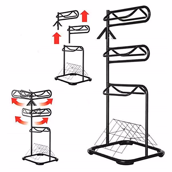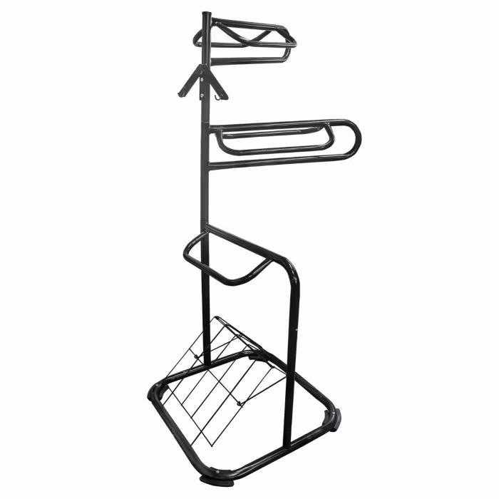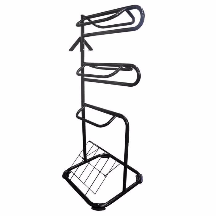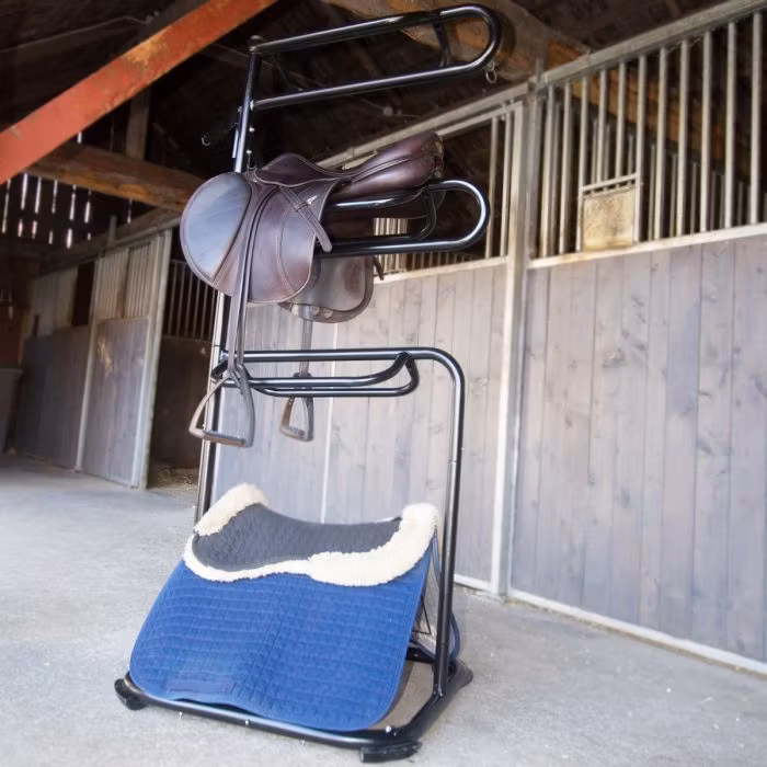 Smidig upphängning av 3 st sadlar Sadelhållare gjord för 3 st sadlar och med hållare i nät för schabrak i botten. Ställningen har tre krokar där du kan hänga träns eller annan utrustning på. Sadelhållaren har en kraftig stomme med överdimensionerad fyrkantig rörkonstruktion i botten för bästa stabilitet. Hållarna är uppdelade, de två översta kan roteras så att du själv kan välja hur du vill att sadlarna ska hänga. Den tredje sadelhållaren är fast och sitter längre ner. Fördelaktigt att hänga en tyngre sadel på den understa hållaren och mindre sadlar på de två översta. I botten finns en hållare i nät för schabrak. Sadelhållaren är enkel att montera, se bild.