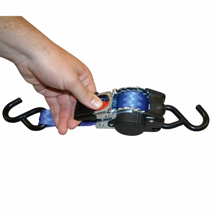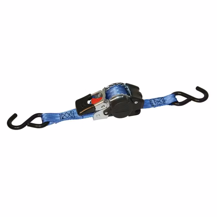Blått spännband med automatisk upprullningsfunktion, 3,0 m • Fastgör lasten snabbt och enkelt • Kan dras in och ut stegvis • För upprullning av bandet är det bara att trycka på knappen • Bandet är skyddat mot väder och smuts, därför längre livslängd • Kvalitetsband liknande säkerhetsbälten i bil (polyester) • Motsvarar DIN EN 12195-2