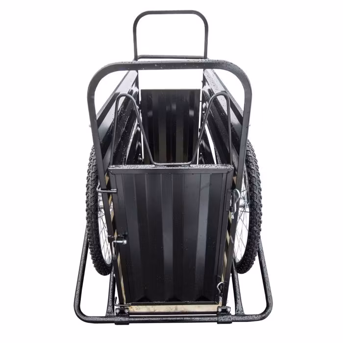 Kalvkärran är höj- och sänkbar för enkel och smidig lastning. Den stängbara dörren i bak och låsgrind i fram håller kalven på plats under förflyttningen. Stora hjul gör kalvtransporten lättkörd även på ojämna underlag. Golv av plyfa och väggar av bockad plåt.