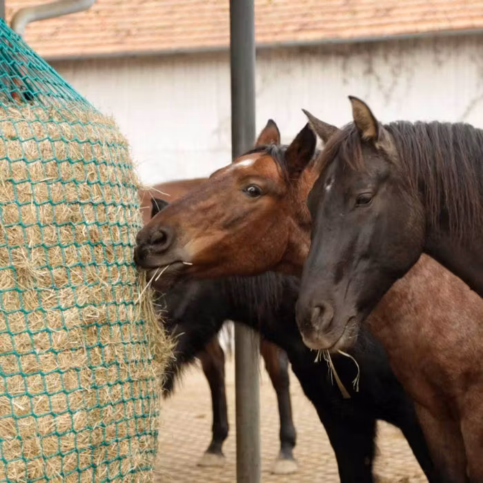 Upphängningsbar slowfeeding-nät för hö- och ensilagebalar till hästar