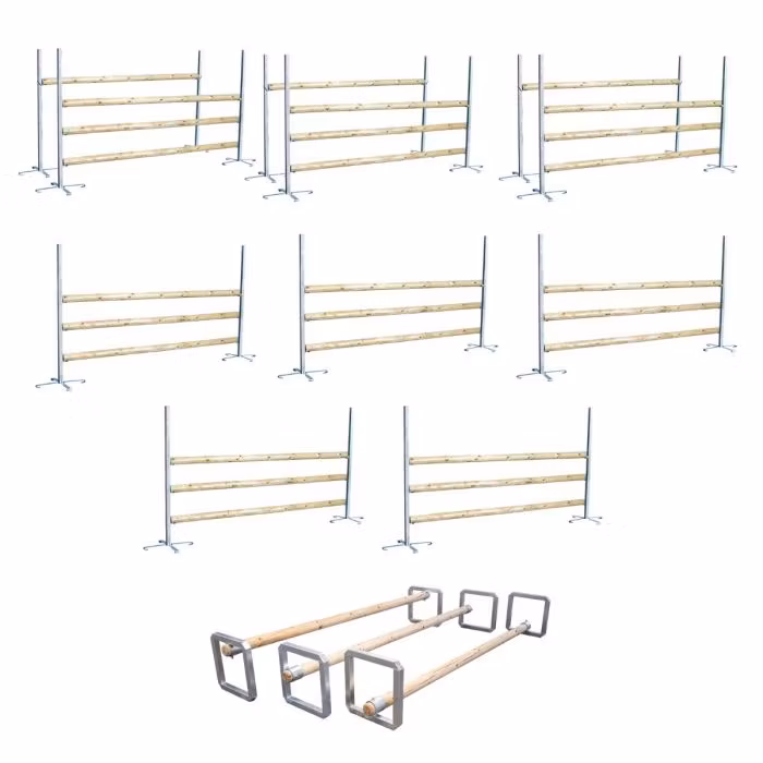 Hinderpaket Plus träning Ett hinderpaket där Pluspaketet ligger som grund och vi har kompletterat med Cavalettipaketet. Hinderpaket Träning-Plus innehåller 22 hinderstöd, 6 cavalettistöd, 30 bommar och 60 bomhållare, det räcker till t ex fem enkelhinder med tre bommar på varje samt tre oxrar med fyra bommar på varje samt tre cavaletti. Det går att göra fler varianter eftersom hinderstöden har hål för skållor på två sidor så du kan placeras skållorna. Galvaniserade lätta hinderstöd som tål att stå ute. Hinderstödet har fötter i fyrkantsprofil i stål och hål för bomhållare med 5 cm mellanrum på två sidor av stolpen. Max bomhöjd 180 cm. Bommarna är rundsvarvade av obehandlad furu, 3 m långa, ø 10 cm. Impregnerad med NTR A. Med cavalettistöd har du möjlighet att välja mellan tre olika höjder på bommen beroende på hur du ställer stödet, 15, 30 eller 45 cm. Fästet för bommen är 10 cm ø. Cavalettistödet är utrustat med en låsbult för att hålla hinderbommen på plats. Ett robust och stadigt stöd av metall som tål tuffa tag, Varmgalvad yta för att klara väder & vind. Lätt att trava på varandra och tar liten plats vid förvaring.