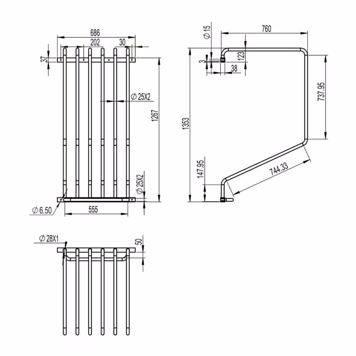 Rören är rejäla, 2,5 cm ø, så du kan hänga upp riktigt tjocka, blöta täcken utan att armarna viker sig. Armarna är svängbara, så när täckena är blöta viker man ut armarna så det blir luft runt varje täcke. När täckena är torra skjuter man ihop armarna åt sidan så tar de minimalt med plats.