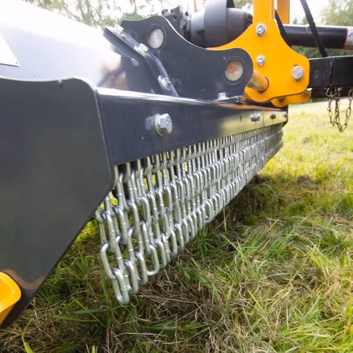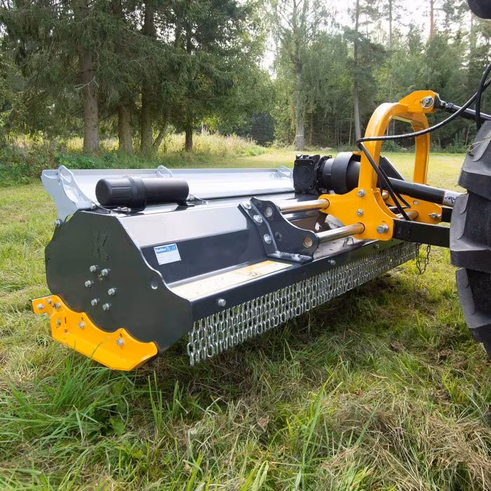 På främre sidan är slaghacken försedd med kedjeskydd som är följsamma mot underlaget och skyddar både traktorn och omgivningen från stenskott och grässtänk.