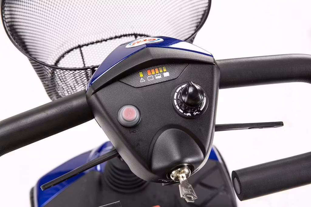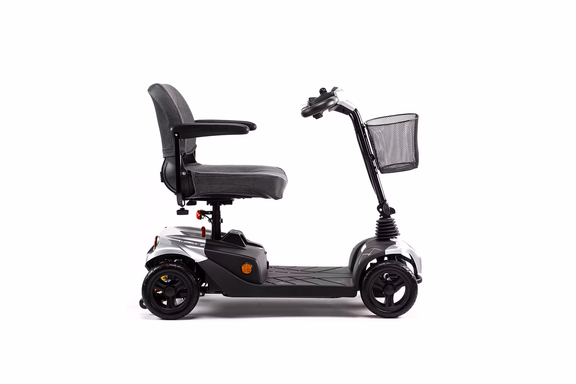Stolen kan justeras i höjdled och kan även vändas helt om så att man kan sitta exempelvis vid ett bord. Den har punkteringsfria däck och en löstagbar varukorg samt komfortfjädring.