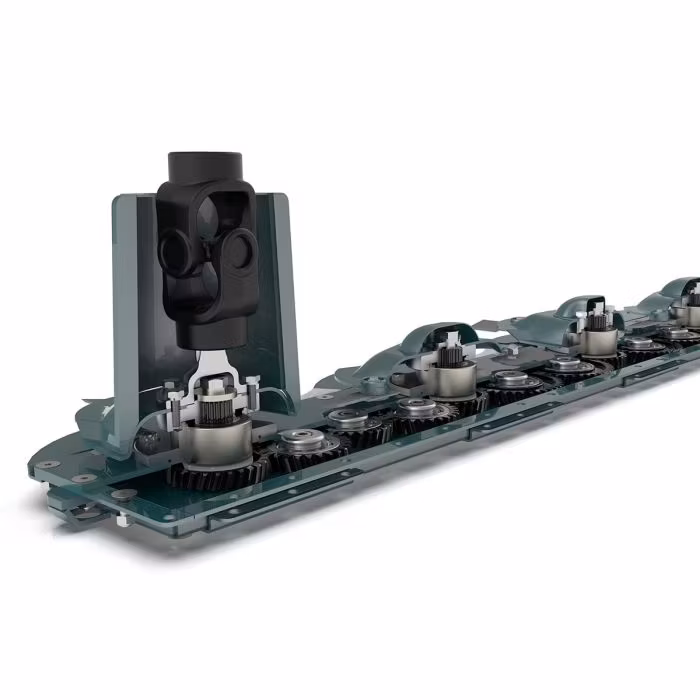 Geometrisk och kraftfull energiöverföring från PTO till balk genom ventilerad remdrift och vinkelväxel.