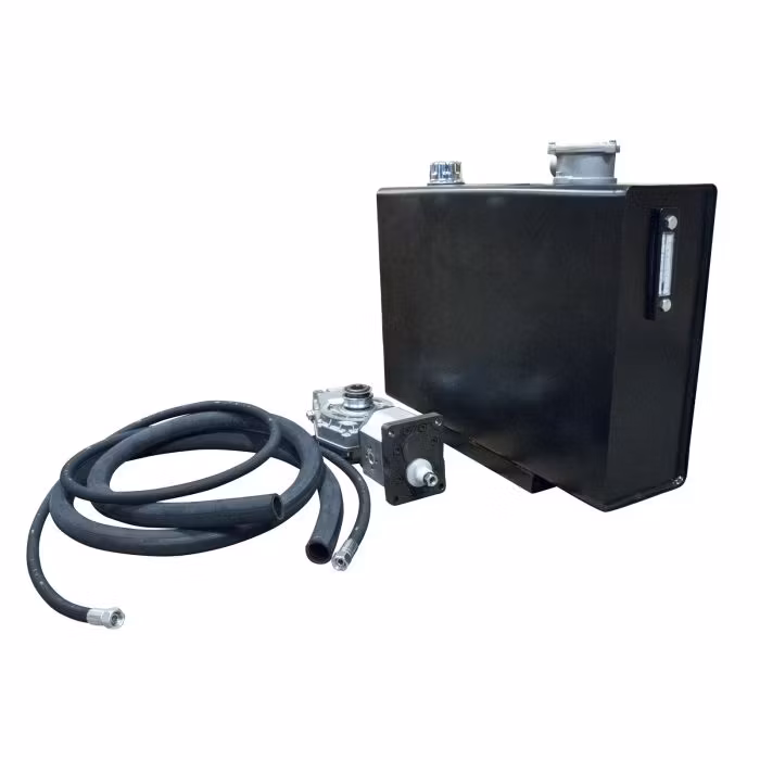Hydraulpump med tank för traktorns kraftuttag Kompenserar ett lågt oljeflöde från traktorer med lägre hydraulkapacitet vilket gör det möjligt att arbeta med kranar eller andra flödeskrävande utrustning. Eller för att separera oljesystemet från traktorns då olika oljekvalitéer förekommer i olika utrustningar. Hydraulpump med stor tank, 75 l, detta är en fördel då höga flöden skapar värme och oljan hinner då svalna i tanken. Tydligt nivåglas med temperatur visning, returoljefilter och stort påfyllningslock. Hydraulsystemet levereras omonterat med grundsats slang och kopplingar, komplettering kan behövas beroende på behov. Det traktordrivna hydraulsystemet passar bl a Kellfri stegmatare.