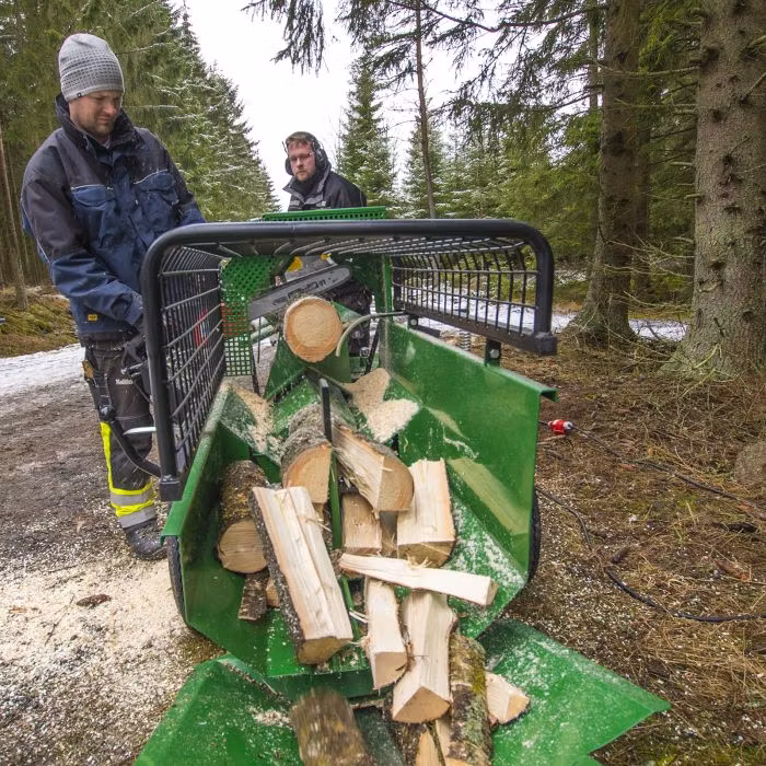Vedmaskinen gör jobbet, kapar och klyver din ved på ett säkert och effektivt sätt. Veden kapas med en 2,4 kW elmotorsåg med 16” svärd, faller därefter ned i klyvrännan vars form säkerställer centrerad klyvning även på klena dimensioner.